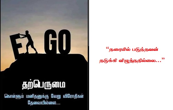 இந்தச் சமுதாயம் நமக்கு எதைக் கற்றுக் கொடுத்தது? ஏற்றத் தாழ்வுகளைத்தானே! ஏழை-பணக்காரன், அதிகாரம் – அடிமை, மேல் சாதி – கீழ் சாதி, ஆண் – பெண், கருப்பு -சிவப்பு இதைத்தானே கற்றுக் கொடுக்கிறது. இதனை வலுக்கட்டாயமாகக் கடைபிடிக்க வற்புறுத்தவும் செய்கிறது. இதனால் நமக்கு சுயம் தலைதூக்குகிறது. அது நமக்குள் தலை கால் தெரியாமல் தலைவிரித்து ஆடுகிறது.
