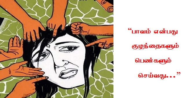 புராணங்களை எடுத்துக் கொள்ளுங்கள் பெண்கள் செய்த பாவத்தில் தான் பூமியே பாவத்தில் மூழ்கியிருக்கிறது என்பார்கள். ஒரு மன்னன் எத்தனை மனைவிகள் வேண்டுமென்றாலும் வைத்துக் கொள்ளலாம். ஆனால் பெண்களோ, குழந்தைகளோ அப்படிச் செய்துவிடக்கூடாது. அது பாவம்.
